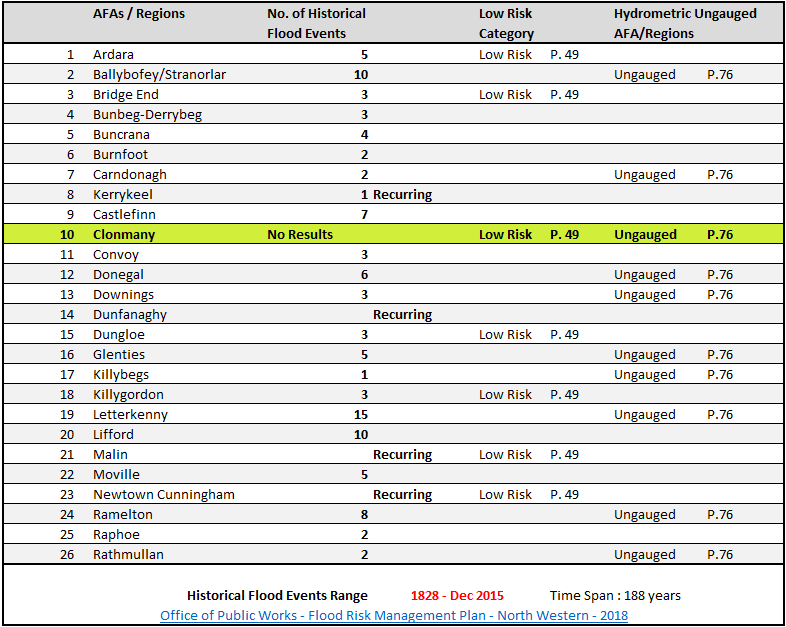 This Flood Risk Management Plan Report has assessed Clonmany as a low/no risk AFA ( Page 13 ). What are the criteria behind this assessment? The report lists no historical flooding history for the region ( Page 23 & 24 ) and informs us that there are no hydrometric gauges in the area. Yet, we are informed that the Ballynahallan River is a significant flood risk and that this river would benefit from the installation of new hydrometric gauging stations ( Page 76 ).