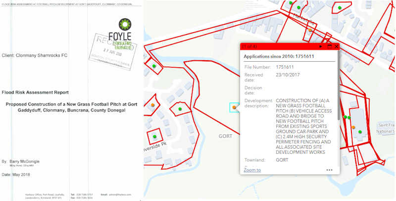 The following is an example of such. The '3.4 Previous Flooding of the Site' section included in a planning application by Clonmany Shamrocks FC for the development of a new grass football pitch. This proposed development was just across the Clonmany River from the Parochial Field and it adjoins the Ballyhallan (Ballynahallan) River. The application's 'Flood Risk Assessment Report' was prepared by Foyle Consulting Engineering using OPW information.
